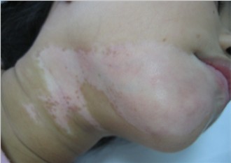 3、白斑形状及面积:白癜风(白斑)早期白斑多为指甲至钱币大,近圆形、椭圆形或不规则形,也有起病时为点状减色斑,境界多明显;有的边缘绕以色素带,初期大部分白癜风(白斑)患者白斑面积较小,有极少数患者初期发病就很快,迅速演变为泛发性白癜风(白斑),白斑面积扩至全身。在少数情况下白斑中混有毛囊性点状色素增殖,后者可增多、扩大并相互融合成岛屿状,白斑处除色素脱失外,患处没有萎缩或脱屑变化。